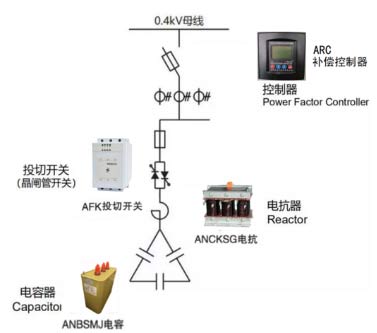 ANSVC無功補(bǔ)償裝置適用于頻率50Hz電壓0.4KV的系統(tǒng)中,ANSVC低壓無功功率補(bǔ)償裝置并聯(lián)在整個供電系統(tǒng)中,能根據(jù)電網(wǎng)中負(fù)載功率因數(shù)的變化控制電力電容器投切進(jìn)行補(bǔ)償。其原理為:ANSVC低壓無功功率補(bǔ)償裝置通過CT采集電流、電壓信號,由無功補(bǔ)償控制器計算,計算出投切電容器的方案,通過投切開關(guān)控制各組電力電容器投切。