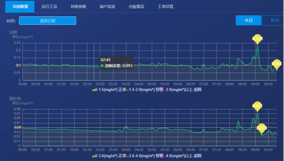 對油煙排污數據的監測,包括油煙排放濃度,顆粒物,NmHc等數值采集監測;同時對監控風機和凈化器的啟停狀態、運行數據進行監測。