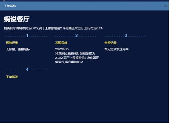 ● 實時監測油煙凈化設備和風機的運行狀態;監測設備開機率和油煙凈化效率;采集油煙排放數據,對排放超標的異常企業進行預警,并對油煙凈化設備清洗超期進行告警;對異常進行工單派發及處理,形成閉環;對各餐飲企業的運行數據進行數據分析,形成多種圖形及報表;設置用戶權限、完善項目和設備信息、設置告警提醒號碼
