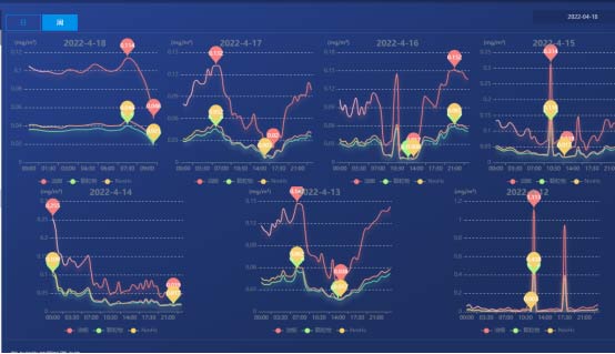 全屏展示界面UI可定制,顯示內容可根據需求調整;地圖點位可根據監測狀態以不同顏色區分,根據區域內油煙濃度情況,劃分不同熱力區塊,凸顯主要區域,地圖可顯示省控點周邊1km和3km區域范圍。