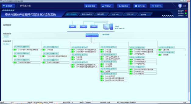 系統支持實時監視接入系統的各設備的通信狀態,能夠完整的顯示整個系統網絡結構;可在線診斷設備通信狀態,發生網絡異常時能自動在界面上顯示故障設備或元件及其故障部位。