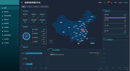 用戶登錄成功之后進(jìn)入首頁(yè),如圖所示。主要展示的內(nèi)容有:項(xiàng)目概況、設(shè)備狀態(tài)、設(shè)備分類、設(shè)備報(bào)警信息、報(bào)警分類、報(bào)警統(tǒng)計(jì)、設(shè)備臺(tái)賬信息等。其中百度地圖可以選配成BIM建筑模型,任何傳感器報(bào)警時(shí)可以在BIM模型中預(yù)警顯示