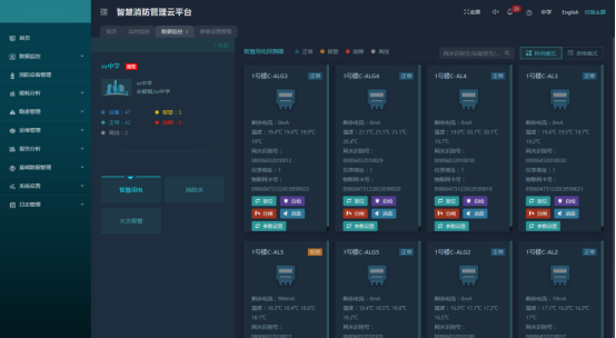 系統(tǒng)可查看設(shè)備的實(shí)時(shí)數(shù)據(jù)和歷史數(shù)據(jù)。針對(duì)電氣火災(zāi)探測(cè)器,可查看剩余電流,溫度,電壓,電流等電參量。當(dāng)超出額定閾值后,能報(bào)警提醒相應(yīng)人員。用戶可通過網(wǎng)站或者APP進(jìn)行復(fù)位,消音,自檢,分閘等遠(yuǎn)程控制。