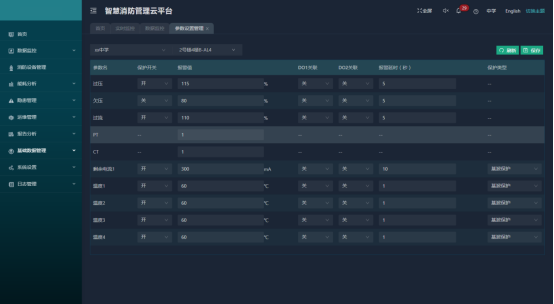 用戶可遠(yuǎn)程設(shè)置設(shè)備參數(shù)。針對(duì)各監(jiān)測(cè)區(qū)域不同的情況,可設(shè)置不同的報(bào)警閾值,如過壓,過流,剩余電流,超溫等報(bào)警值。