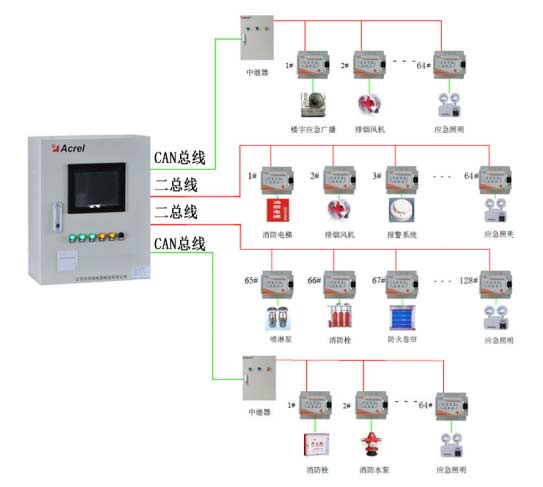 在本項(xiàng)目的設(shè)計(jì)中,按需選用了消防設(shè)備電源監(jiān)控器(主機(jī))、電壓傳感器、電壓/ 電流傳感器。采用二總線通訊方式,布線方便。