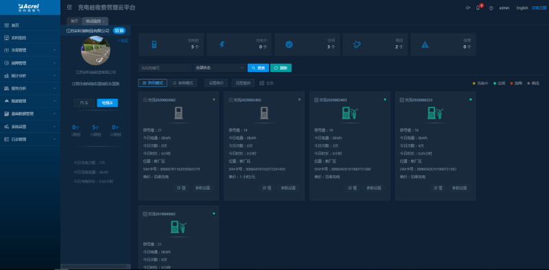 展示當前充電站各充電樁的狀態(tài)及實時充電數(shù)據(jù),統(tǒng)計站點和各充電樁今日充電數(shù)據(jù),支持充電單價、設(shè)備重啟、充電/報警/保護等參數(shù)的遠程批量下發(fā),其中對于遠程參數(shù)設(shè)置進行了權(quán)限控制,未授權(quán)的用戶不可操作,確保現(xiàn)場設(shè)備正常運行。