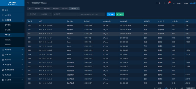 顯示所有訂單數(shù)據(jù),可以對訂單按照充電站、充電樁、支付方式、交易狀態(tài)等進行分類查詢,可對充電中的充電樁進行停止充電操作。