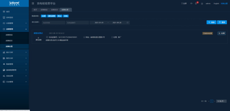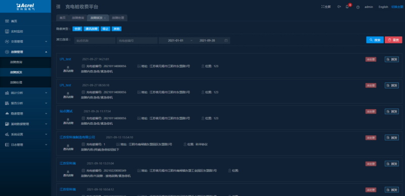 顯示充電樁的故障信息及處理進度,故障類型包括過壓、欠壓、空載、絕緣檢測故障、漏電、過溫、短路等。