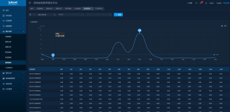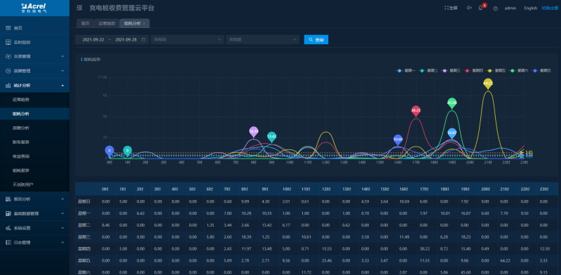可查看指定時段充電站和充電樁的用電量,顯示對應的能耗趨勢圖并進行同環(huán)比分析。