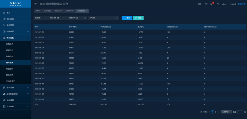 可根據(jù)時間查看關(guān)聯(lián)站點的財務(wù)數(shù)據(jù),包括預付金額、消費金額、退款金額、充值金額、賬戶余額等,可導出成excel表格。