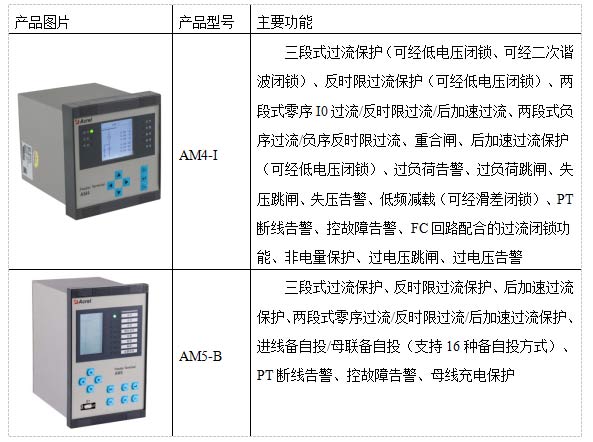 本次針對廣西新柳南高速公路配電工程項目中不同對象配置不同的微機保護裝置,10kV進線柜、變壓器出線柜均配置AM4-I微機保護裝置;高壓自動轉換開關柜中主供進線配置AM5-B備自投保護裝置,實現兩路進線的自動切換功能。這兩款微機保護裝置主要通過以下保護功能實現對高壓柜的設備運行情況實時監視和保護: